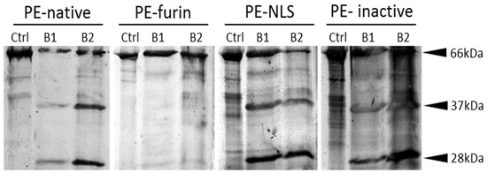 In this study, we focused on Exotoxin A (PE) and its three PE muteins: PE-NLS, PE-furin and PE-inactive (Figure 1). The newly designed mutein, PE-NLS, has a nuclear localization signal sequence (RRRKPPPRR) inserted at the C-terminus (prior to REDLK sequence), which should target the toxin to the nucleus [24]. Importantly, according to the 3D structure, the inserted NLS is not located in the proximity of substrate binding loops and thus the introduced motif should not affect the catalytic activity of the toxin. The PE-furin contains a point mutation G280V in the P1’ position of the furin cleavage site. This mutation makes PE resistant to furin [25,26], as we wanted to verify whether the cleavage by furin is critical for PE activation. The PE-inactive, used as a control, corresponds to a triple mutant (Q483A, D484A and D488A) with negligible ADP-ribosylation activity as reported previously (relative kcat value was <0.5% of the wild-type value) [27], while retaining its ability to bind substrates.