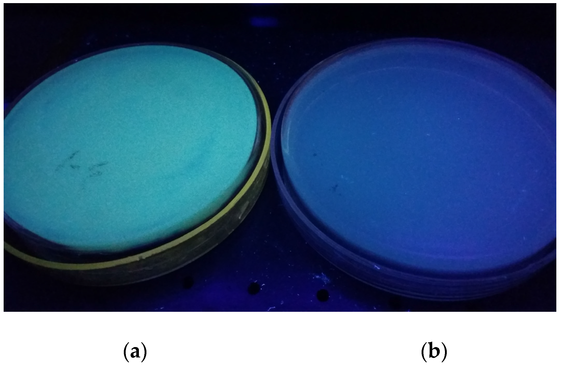 Green fluorescence (a) on the reverse of the colony of O1 (an Ochratoxin A (OTA)-producing strain) grown on Czapek’s Agar medium (CA) when was exposed to long wavelength UV light (365 nm). No fluorescence (b) was displayed by a non-OTA-producing strain in the same conditions.