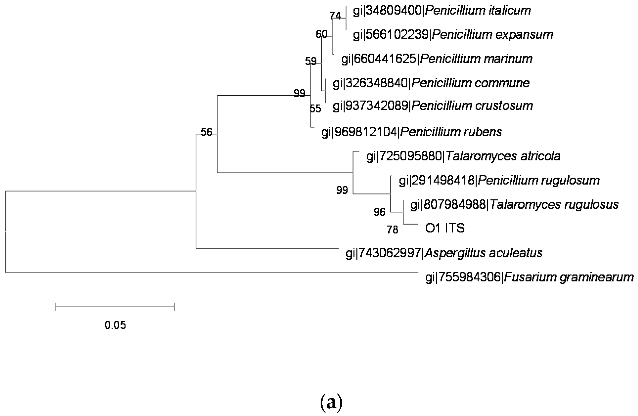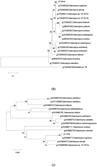 The phylogenetic tree of the O1 strain by the Neighbor-Joining method based on analysis of ITS, BenA and RPB2 sequences. (a) the phylogenetic tree based on analysis of ITS; (b) the phylogenetic tree based on analysis of BenA; and (c) the phylogenetic tree based on analysis of RPB2.