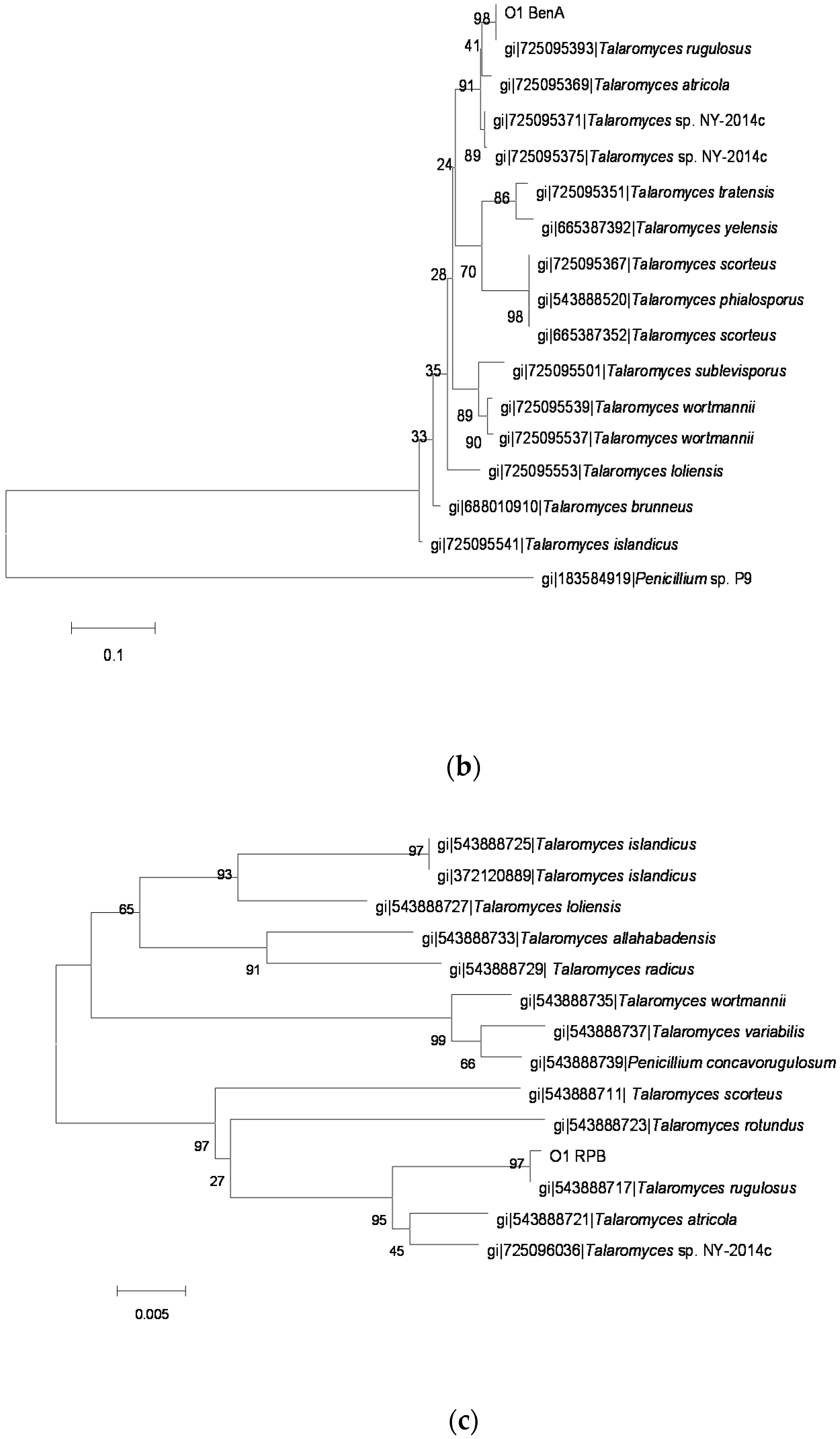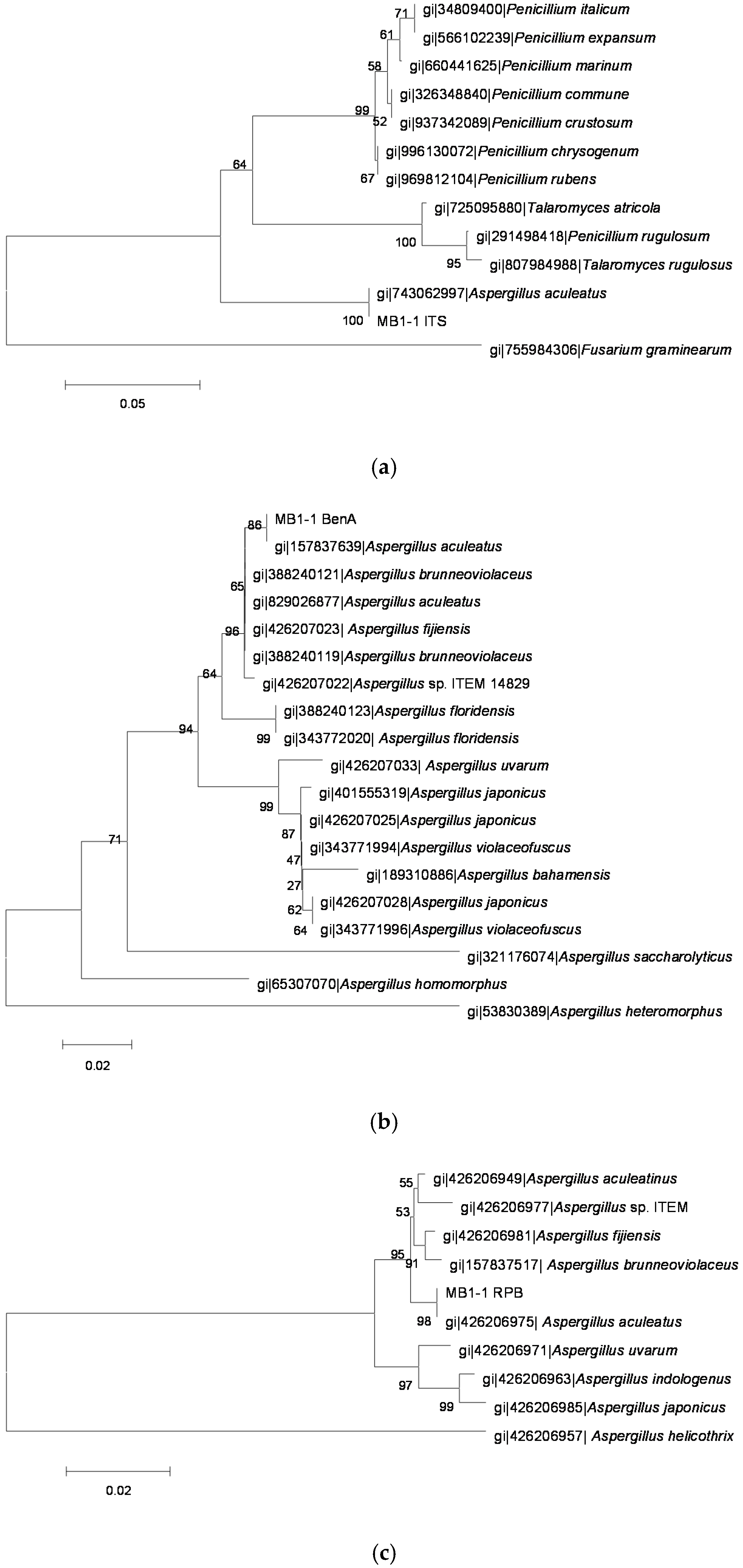 The phylogenetic tree of the MB1-1 strain by the Neighbor-Joining method based on analysis of ITS, BenA and RPB2 sequences. (a) The phylogenetic tree based on analysis of ITS; (b) the phylogenetic tree based on analysis of BenA; and (c) the phylogenetic tree based on analysis of RPB2.