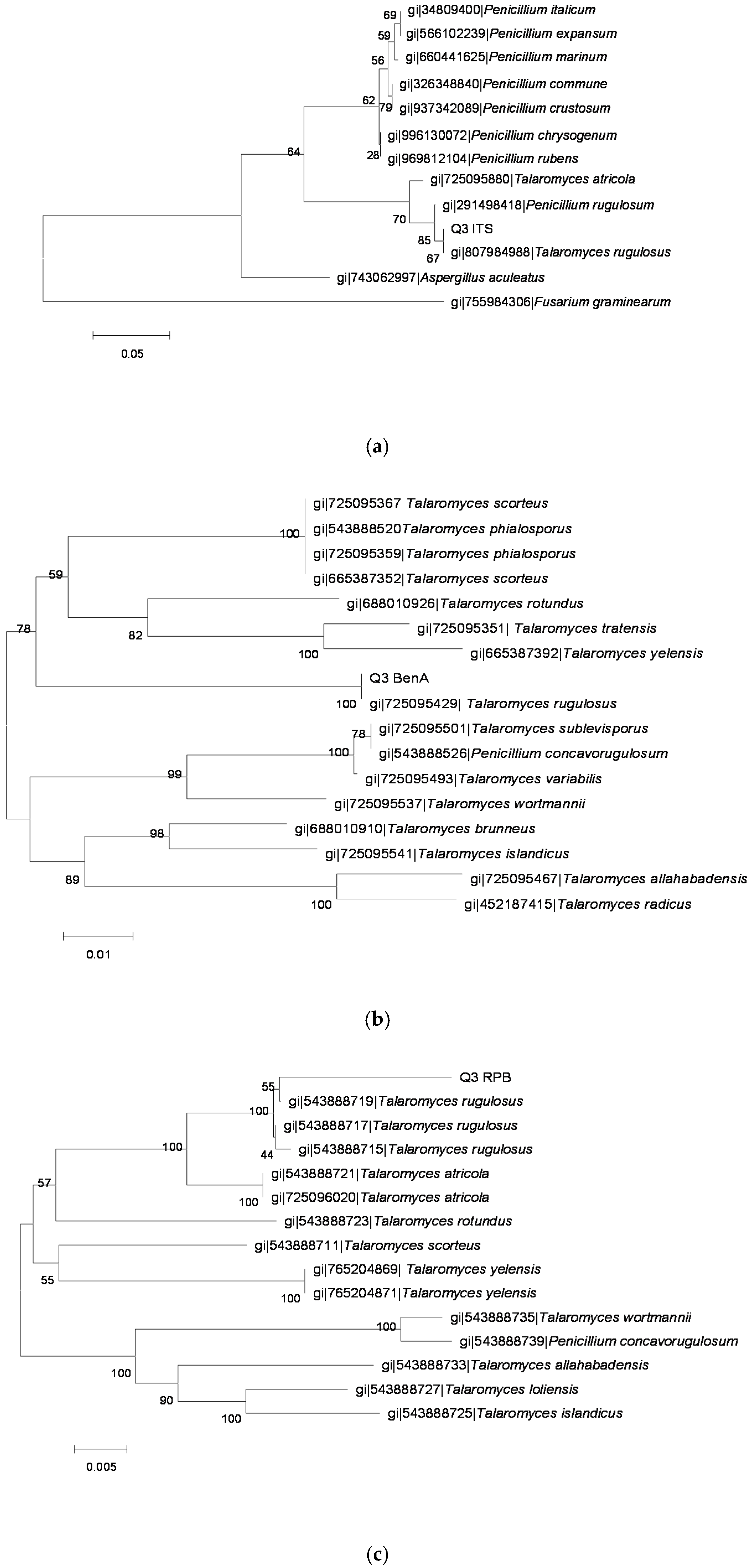 The phylogenetic tree of the Q3 strain by the Neighbor-Joining method based on analysis of ITS, BenA and RPB2 sequences. (a) the phylogenetic tree based on analysis of ITS; (b) the phylogenetic tree based on analysis of BenA; and (c) the phylogenetic tree based on analysis of RPB2.
