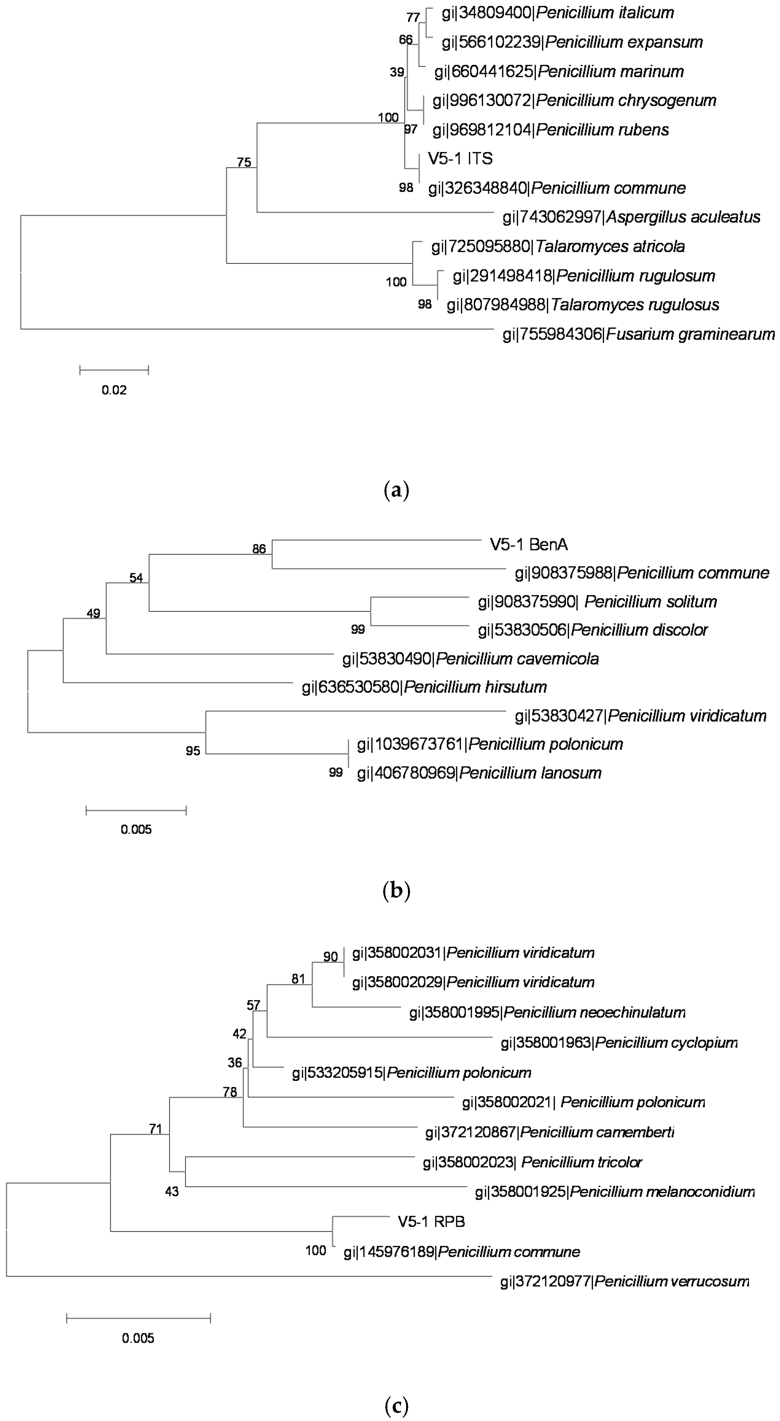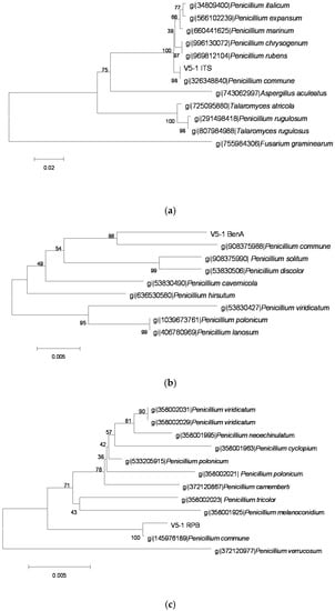 The phylogenetic tree of the V5-1 strain by the Neighbor-Joining method based on analysis of ITS, BenA. and RPB2 sequences. (a) The phylogenetic tree based on analysis of ITS; (b) the phylogenetic tree based on analysis of BenA; and (c) the phylogenetic tree based on analysis of RPB2.