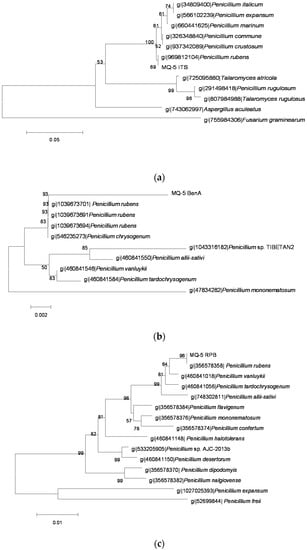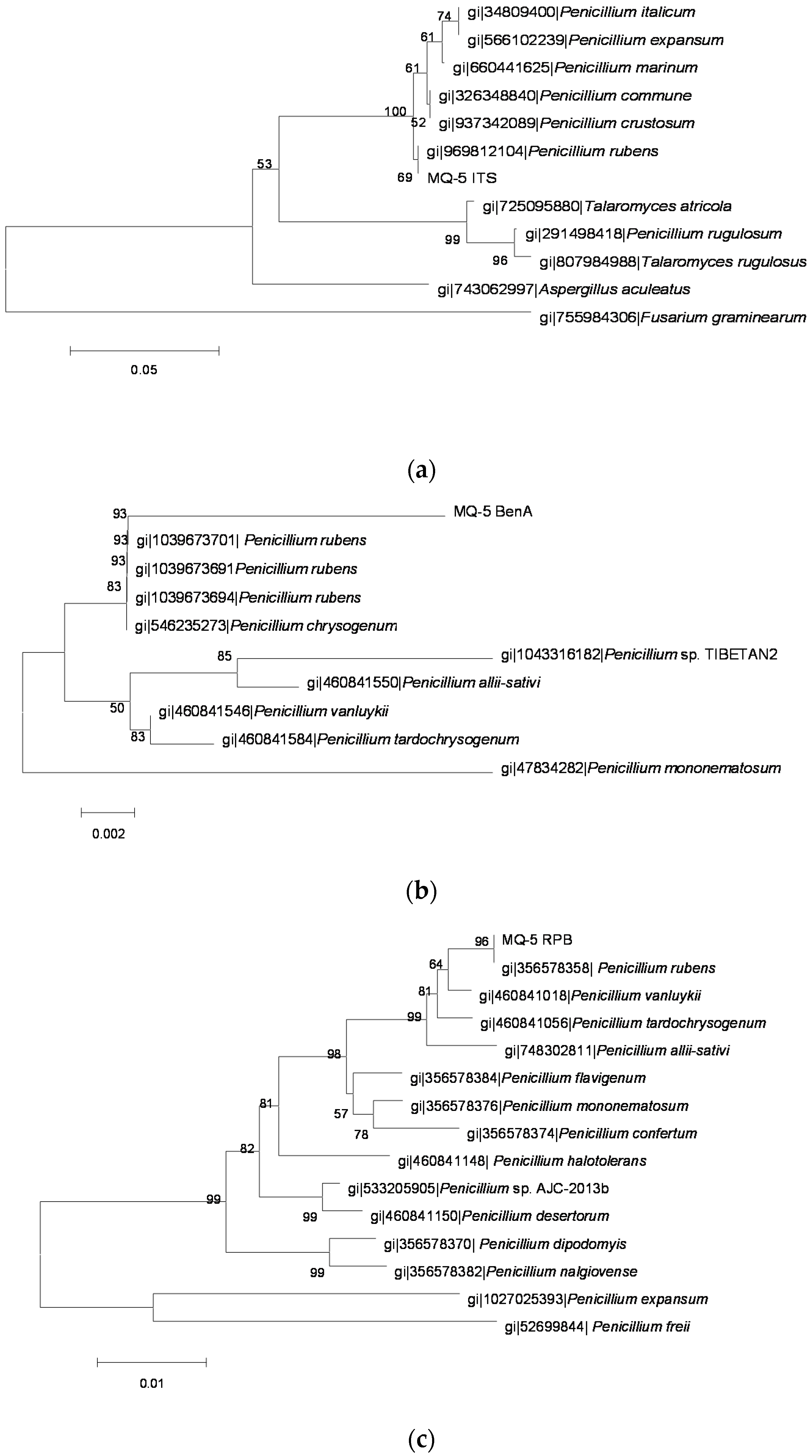 The phylogenetic tree of the MQ5 strain by the Neighbor-Joining method based on analysis of ITS, BenA and RPB2 sequences. (a) the phylogenetic tree based on analysis of ITS; (b) the phylogenetic tree based on analysis of BenA; and (c) the phylogenetic tree based on analysis of RPB2.