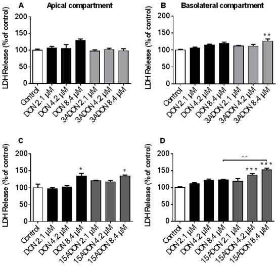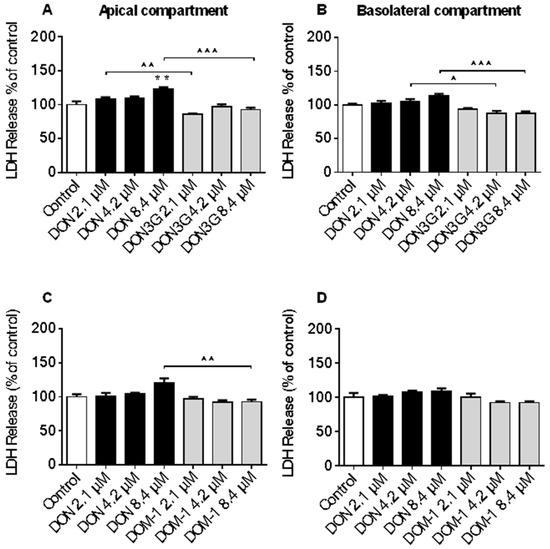 2.1. Comparison of Lactate Dehydrogenase (LDH) Leakage Induced by DON and Its Derivatives and Metabolites