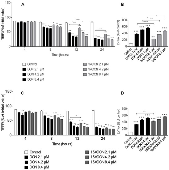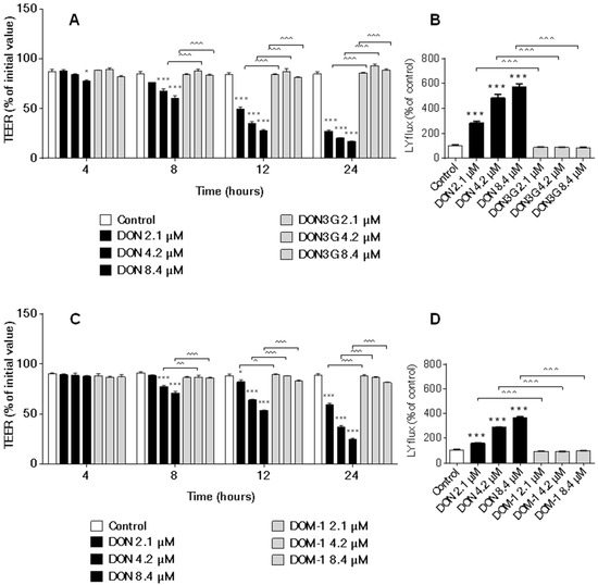 2.3. Comparison of Changes in Paracellular Transport across the Monolayer Induced by DON and Its Derivatives and Metabolites