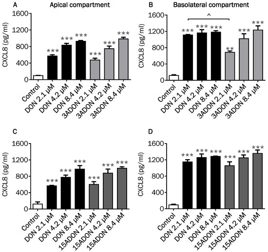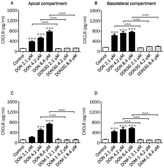 2.4. Comparison of Changes in CXCL8 Secretion Induced by DON and Its Derivatives and Metabolites