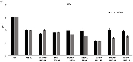 Changes in the pH of the media after the liquid culture test. In PD after seven days of incubation (a) and in YES after four days of incubation (b). The error bars show the standard deviations (n = 4).