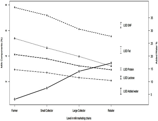 Variation in milk composition and total addition of water at different levels in informal milk marketing chains averaged across seasons for the year (data presented as means with least significant differences for each parameter). Note: ο, +, ∆, x and ◊ describe the values of solids not fat (SNF) lactose fat protein and added water respectively.