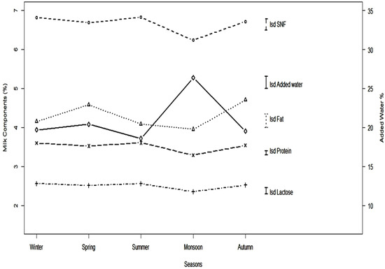 Differences between the values for mean added water (%) in various seasons of the year were highly significant (SED = 1.54: p < 0.001). The highest percentage (26.39) was found in the monsoon season whereas the lowest value for addition of water (18.59) was observed in summer. This was the reason for the lower milk constituent concentrations in the monsoon season and higher levels in summer.