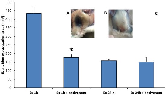 Groups of 5 of CD-1 mice (18–20 g) received an intravenous (i.v.) injection of 200 μL of an Evans blue (EB; Sigma-Aldrich, St. Louis, MO, USA) solution (6 mg/mL; 60 mg/kg). Twenty min after EB injection, mice were injected intradermally (i.d.) with 50 μL of exudate samples collected 1 h and 24 h after venom injection in mice. In some groups, 40 μL of polyvalent antivenom (anti-Bothrops, Crotalus and Lachesis antivenom, Instituto Clodomiro Picado, Vázquez de Coronado, Costa Rica) was added to 250 μL of exudate and incubated for 20 min before injection, in order to neutralize the venom toxins that might be present in the exudates. Control groups of mice received either normal mouse plasma or antivenom. One hour after exudate injection or, in the case of controls, plasma or antivenom injection, animals were sacrificed, their skin was removed, and the areas of EB extravasation in the inner side of the skin were measured. To rule out the possibility that an increase in vascular permeability was due to the presence of bacterial lipopolysaccharide, exudate samples were incubated with polymyxin B (15 μg/mL) before testing in the mouse model as previously described [].