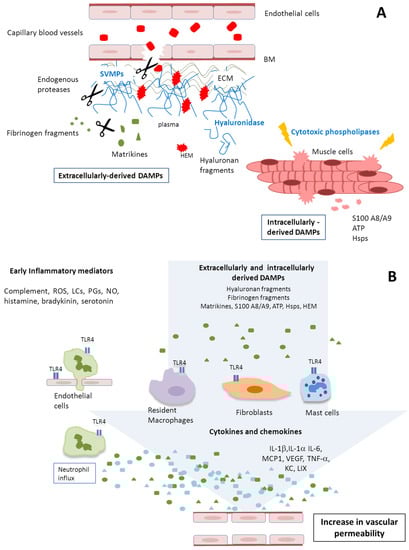 Hypothetical summary of the proposed events occurring in tissue injected with B. asper venom. (A) Venom toxins, particularly snake venom metalloproteinases (SVMPs), PLA2s and hyaluronidases, induce direct damage to the tissue, especially acute muscle fiber necrosis and degradation of extracellular matrix components, such as those of the basement membrane of capillary vessels, and other matrix molecules, including hyaluronic acid. Acute inflammation ensues, with the release of many types of mediators that promote an increase in vascular permeability, recruitment of inflammatory cells, and pain. Such acute tissue damage is also associated with the release of multiple damage associated molecular pattern molecules (DAMPs), both intracellular and extracellular; (B) DAMPs act on a variety of cells, including endothelial cells, other resident cells, and incoming inflammatory leucocytes, to generate diverse tissue responses, such as increase in vascular permeability, and the synthesis of a variety of cytokines and chemokines, which further contribute to the inflammatory scenario in a highly complex interplay. ROS: Reactive oxygen species; LCs: leukotrienes; PGs: prostaglandins; NO: Nitric oxide.