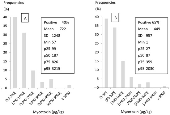 Toxicity of mycotoxins and regulations concerning their maximum tolerable level in human food and animal feed have prompted the development of a large number of analytical methods for their identification and quantitation [80,81]. Sampling plays a crucial role in the precision of mycotoxin levels and is usually the main source of variation associated with mycotoxin analysis, causing nearly 90% of the error in some analyses [82,83]. Whatever the method of analysis used, mycotoxin concentration is usually expressed in µg/kg on a dry material basis. Positive results are those observed in samples that are above the limit of detection (LOD) and quantifiable results are those that are above the limit of quantitation (LOQ). Because LOD and LOQ strongly vary with the method of analysis used, care should be taken on comparison of data obtained from different assays [81,82,84,85,86]. The development of more sensitive methods of analysis leads to an increase of the number of positive samples, which considerably modifies the descriptive statistics of the contamination (Figure 1). With highly sensitive methods of analysis, virtually all the large batches that are correctly sampled can be contaminated [83,87]. The observation of a large number of positive samples in a cohort reveals that contamination is frequent, not always that the risk of mycotoxicosis is high. On the contrary, an increase in the number of positive samples generally leads to a decrease in the mean, the median, and the 75th percentile, which does not mean the risk of mycotoxicosis has decreased.