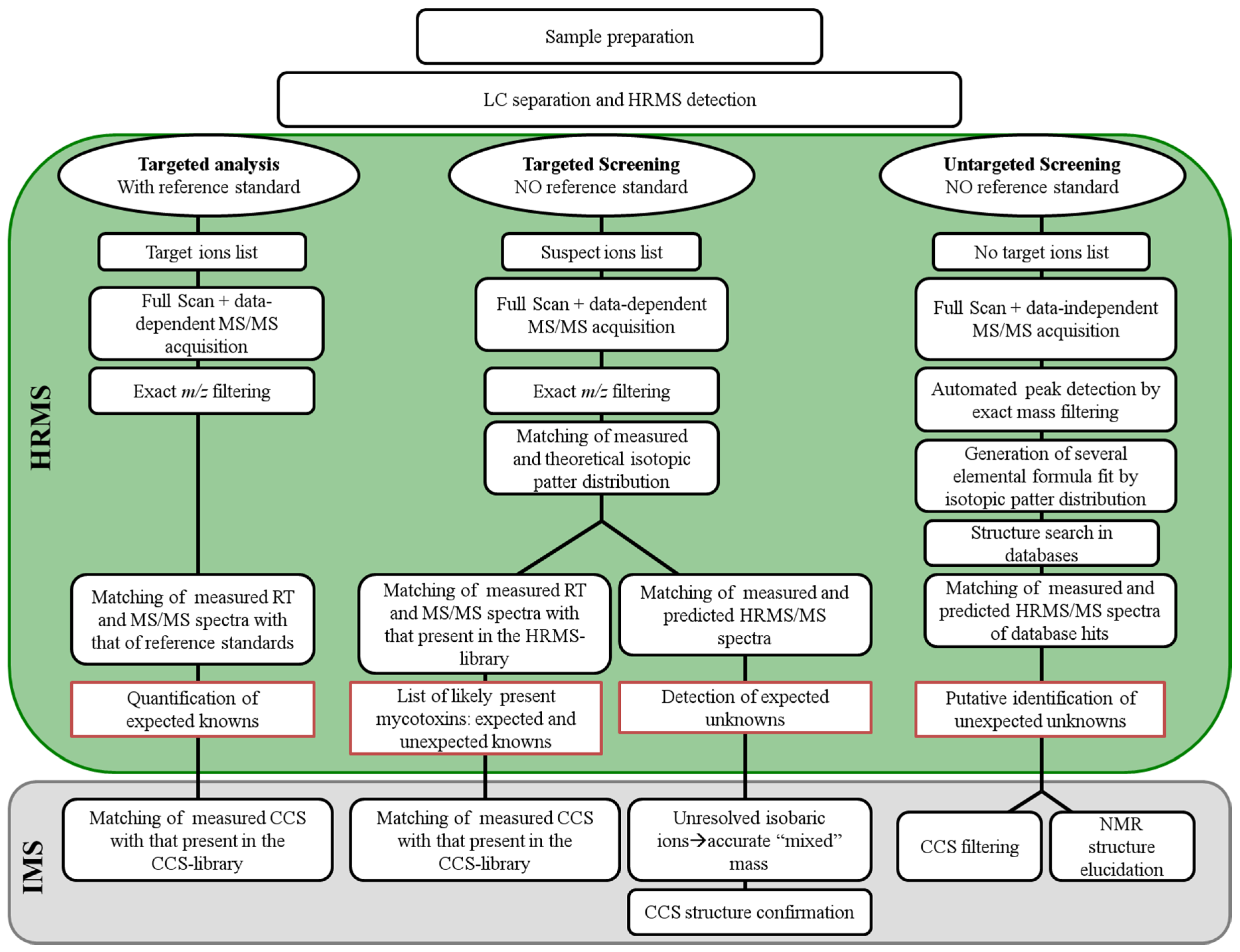 Workflow for targeted analysis with mycotoxin reference standards, targeted screening without analytical standards, and untargeted screening for unexpected unknowns (adapted from Krauss et al. [25]). CCS = Collision Cross Section.