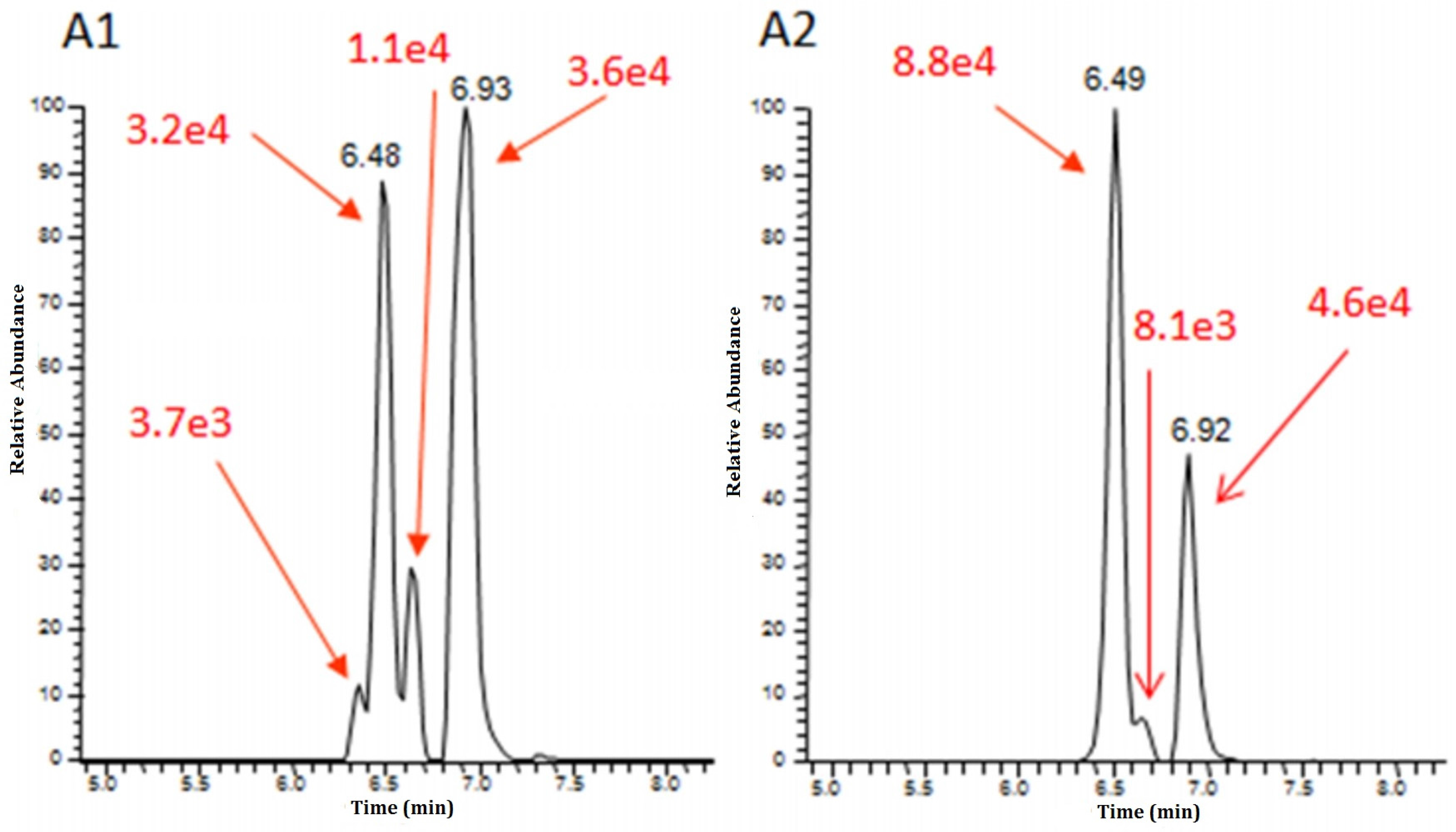 Extracted ion chromatogram for DON di glucosides determined in malt (A1) and beer (A2) by using HILIC phase chromatography coupled to HRMS (Orbitrap). (Reproduced with permission from [29], copyright (2016) American Chemical Society).