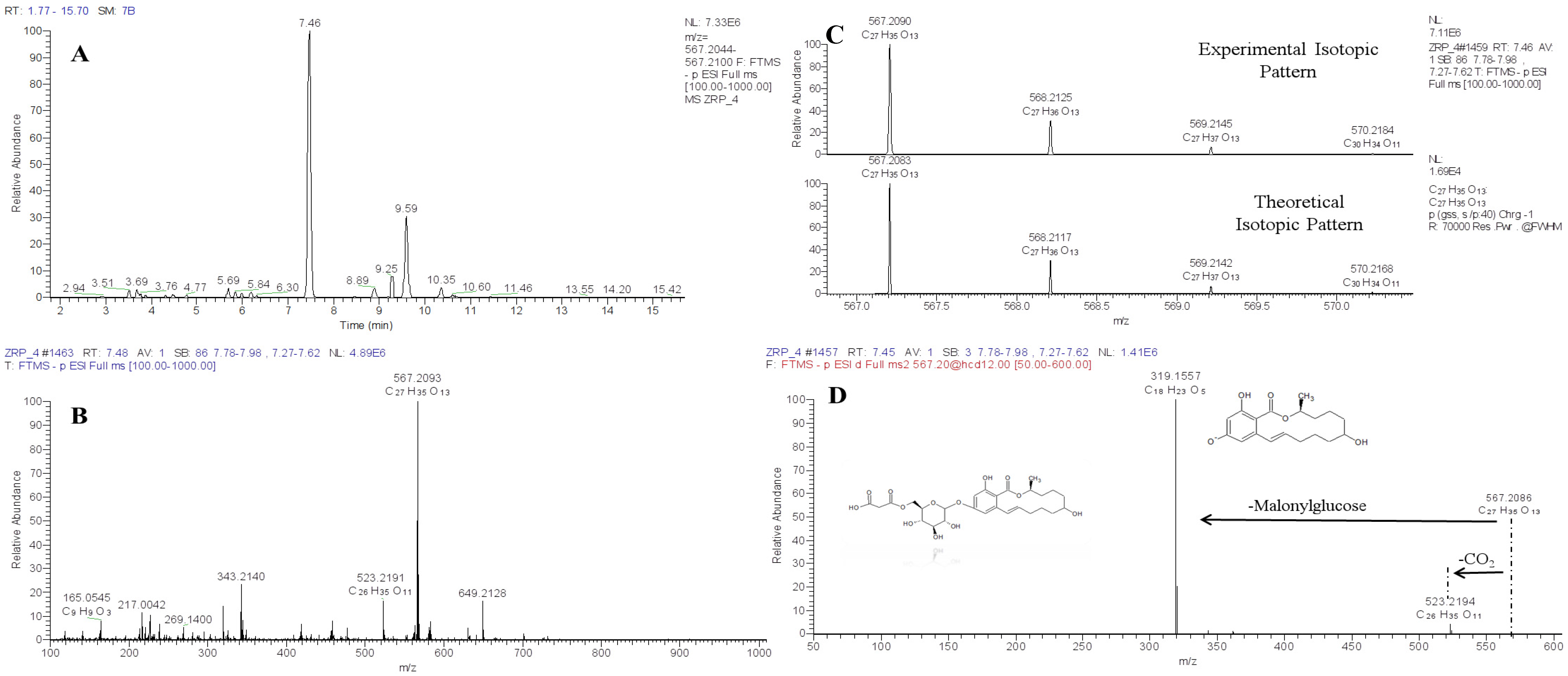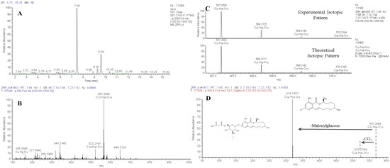 ZEL-MalGlc putative identification steps: UHPLC-Q-Exactive (A) full scan extracted ion chromatogram (resolving power 70,000 FWHM, extraction window 5 ppm); (B) molecular formula assignment of parent ion; theoretical and experimental isotopic pattern comparison (C,D) high resolution fragmentation pathways obtained by using DDA acquisition.