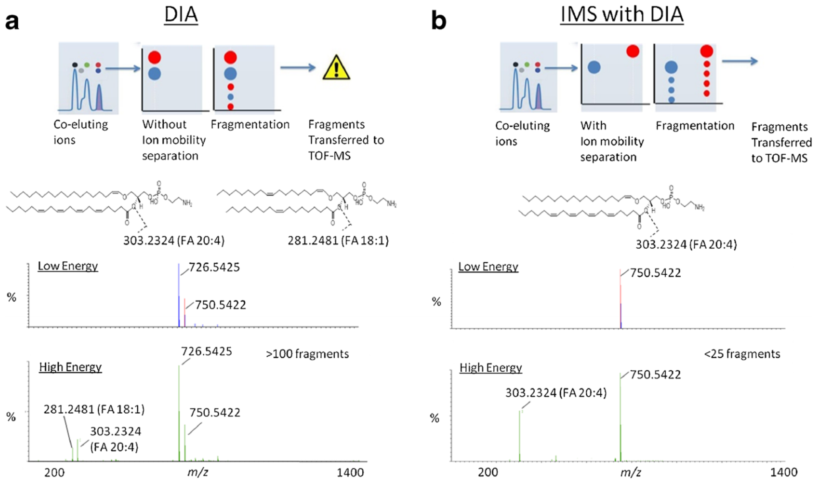 MS and MS/MS cleaner mass spectra obtained by using LC-IM-QTOF (b) compared to those obtained by LC-QTOF (a) (from Paglia et al. [86]).