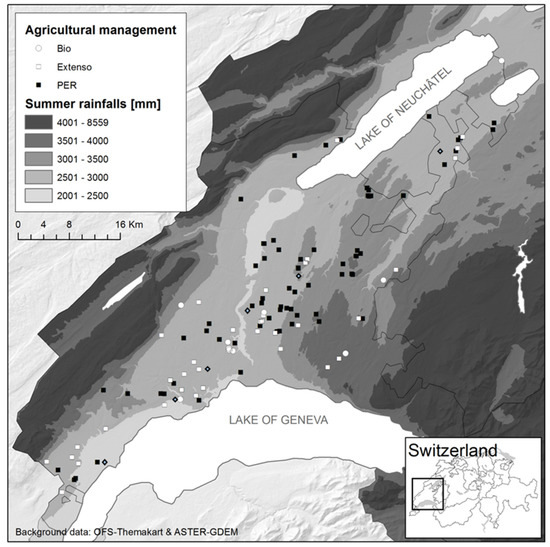 Study area in the granary region of Vaud (Switzerland). The white and black dots correspond to the sampled wheat fields and the blue ones to grain terminals. The farming system used in wheat fields is indicated: white circle for organic farming, white square for extensive farming and black square for conventional farming. The background represents the summer rainfall level.