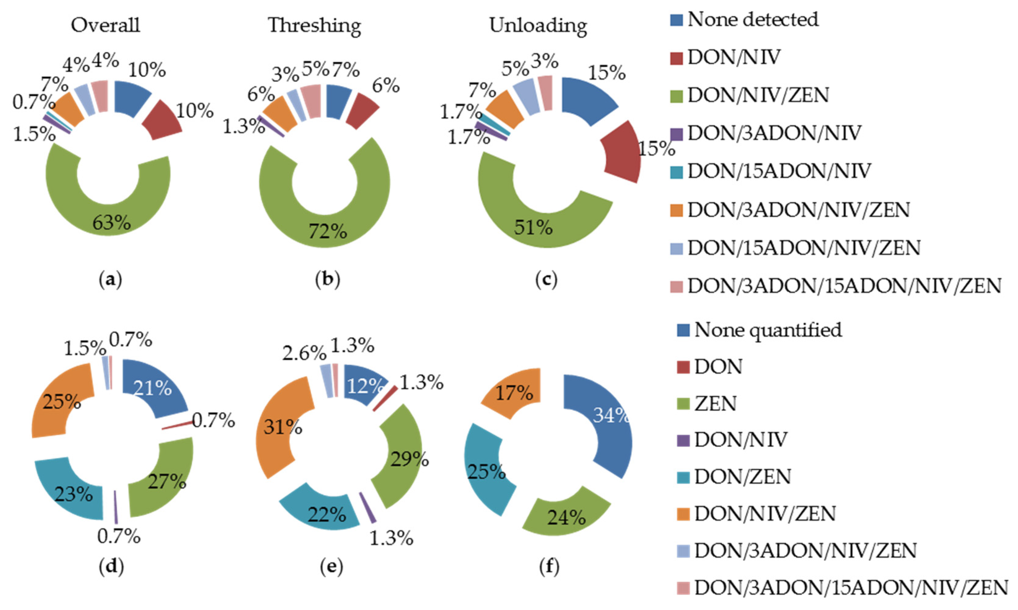 Co-occurrence of mycotoxins in aerosols. (a–c) The proportions of samples for which the different combinations of mycotoxins were detected in, respectively, overall threshing and grain unloading samples; (d–f) Samples for which all mycotoxins from a particular combination were detected at a quantifiable level.