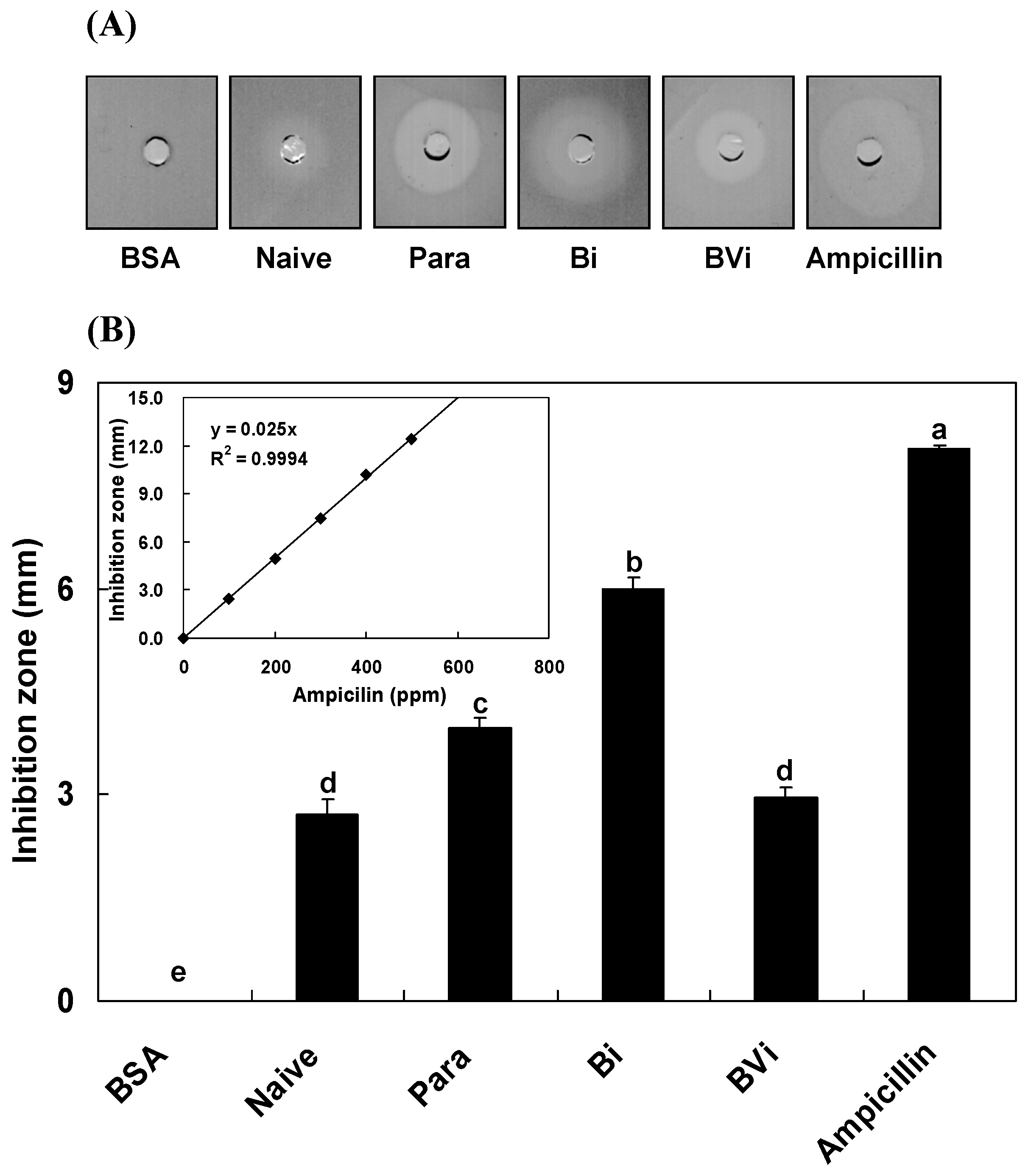 An inhibition zone assay was used to measure the antimicrobial activity of the collected host hemolymph according to the previously described approach [77]. E. coli K12 strain (Molecular Probe, Eugene, CA, USA) was used for the assay, and each Petri dish (dia. = 9.00 cm) contained 1 × 104 bacteria. The antibiotic ampicillin (350 ppm) and BSA (350 ppm) were used as the negative and positive controls, respectively. The volume of each sample was 10 µL. Each treatment and corresponding control was repeated 5 times. The series of ampicillin concentrations was 0, 200, 400, 600 and 800 ppm, which were used to construct a standard curve [52] to calculate the relative value of the inhibition zones of each treatment.
