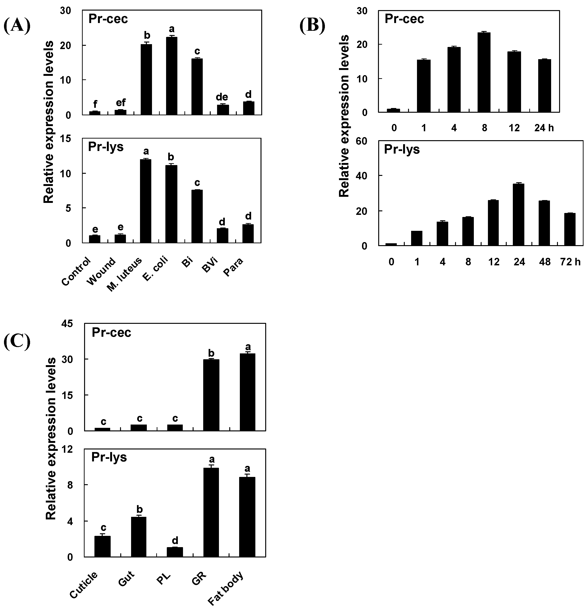 2.5. Tissue Distribution of Pr-cec and Pr-lys Gene Expression