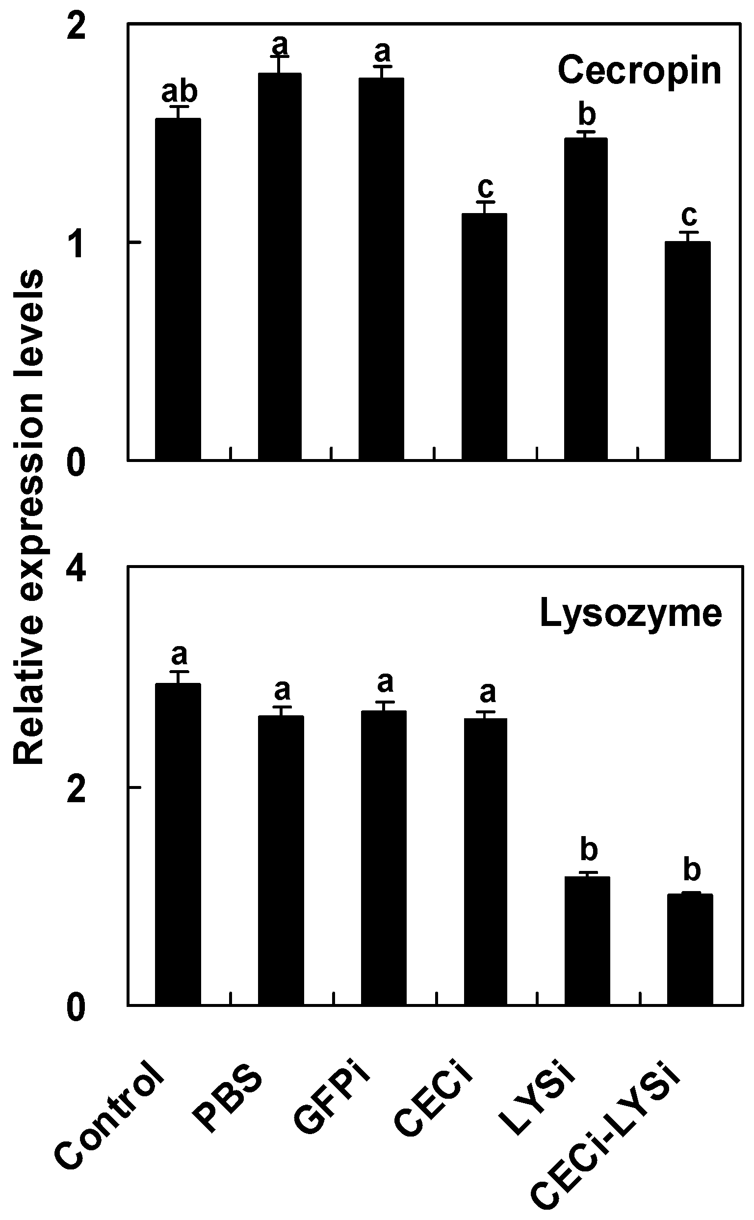Immunologically naive pupae (1 d after pupation) were first challenged by bead injection as described above. Post bead induction, the treated pupae then were injected with 20 µg of dsRNA in 2 μL of water for the Pr-cec and Pr-lys genes, the combination of the two dsRNAs for the Pr-cec and Pr-lys genes together (experimental), and the EGFP (control) gene (control). PBS injection controlled for the influence of PBS on mRNA expression. Each treatment or control was replicated 8 times:5 times for qPCR and 3 times for the inhibition zone assay.