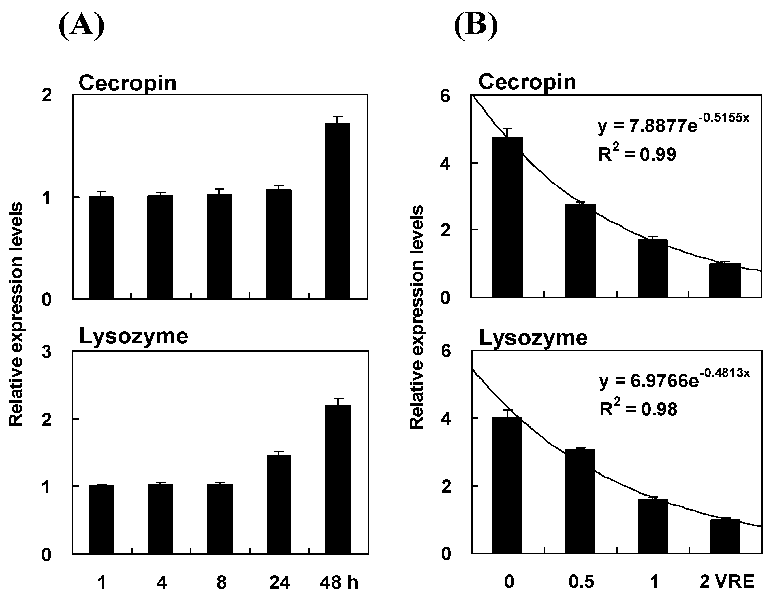 For the time course assay of venom effects on Pr-cec and Pr-lys gene expression, 50 Sephadex beads plus venom (2 VREs) were injected into an immunologically naive pupa. To assay the dose effect, beads plus different doses of venom, including 0, 0.5, 1 and 2 VREs, were injected into an immunologically naïve pupa. The total RNA samples were isolated from the injected pupae at 1, 4, 8, 24 and 48 h post treatment for the time course and 8 h for the dose effect assays. The transcripts levels of the Pr-cec and Pr-lys genes in each total RNA sample were estimated as described above.