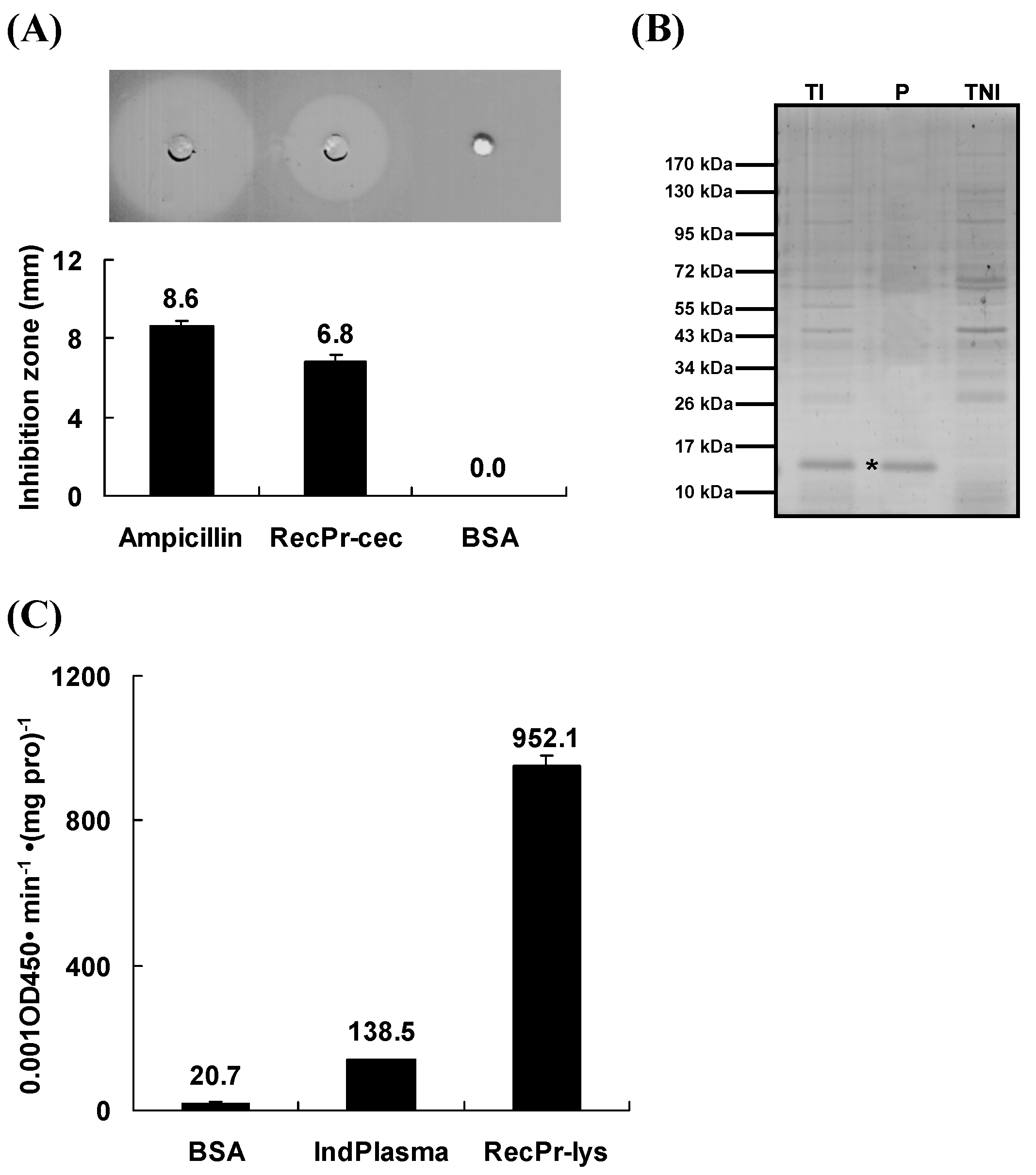 Activity assays for synthesized Pr-cec and recombinant Pr-lys. (A) Inhibition zone assay for synthesized Pr-cec (SynPr-cec) using ampicillin (350 ppm) as the positive control and 10 µg of BSA as the negative control. (B) An 15% SDS-PAGE analysis for recombinant Pr-lys (RecPr-lys) products under reducing conditions. “TI” represents the total protein (20 µg) of the induced E. coli Transetta (DE3) clone recombinantly expressing RecPr-lys. “P” indicates purified RecPr-lys (2 µg). “TNI” represents the total protein (20 µg) of the non-induced clone as described above. The asterisks represent the RecPr-lys band. (C) Absorbance assay for RecPr-lys, using M. luteus as the substrate, and bead-induced plasma (IndPlasma, with a total protein content of 10 µg) and BSA solution (10 µg) as the controls. Values are the means ± SE (n = 3).