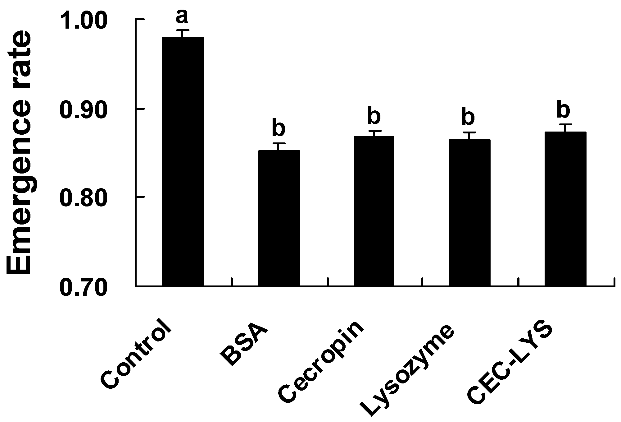 Immunologically naïve pupae (1 d after pupation) were parasitized by P. puparum as mentioned above. At 2 h post successful parasitism, the parasitized pupae were injected with SynPr-cec (10 µg), RecPr-lys (10 µg), and a mixture of SynPr-cec (5 µg) and RecPr-lys (5 µg). The injection volume was 2 µL using both parasitized pupae without injection and pupae that were injected with BSA (10 µg) as controls. In this experiment, a total of 100 of pupae were used and divided into 5 groups. Each group contained 20 treated or control pupae, and each pupa was one replicate for the emergence rate calculation.