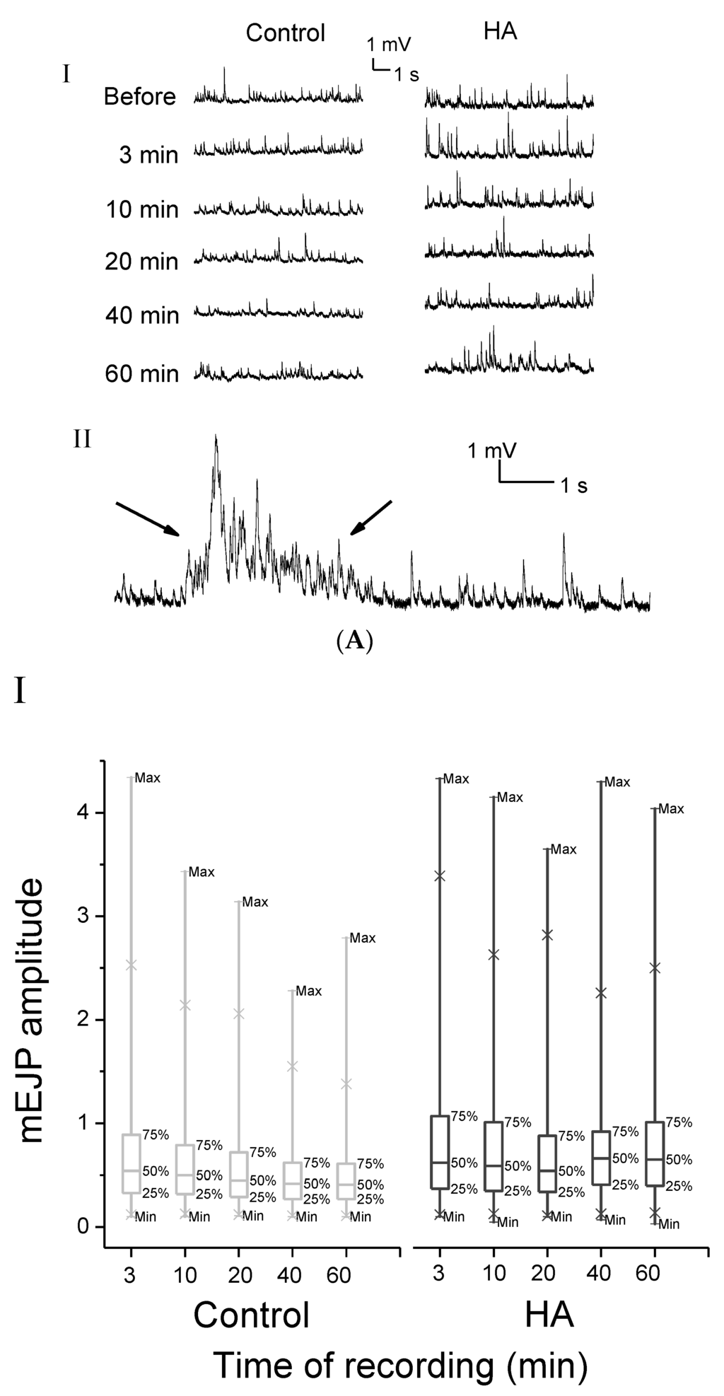 At 0.1 Hz nerve stimulation, the representative of mEJP traces in control and in the presence of HA are shown in Figure 2A. The release rate of mEJPs finally increased after HA application, but that of the control decayed with time (Figure 2A-I). We also recorded the overlap and summation of mEJPs recorded after 20 min by HA application, which occurred in about 33% of the total recordings (Figure 2A-I). By box plots of mEJP amplitudes (Figure 2B-I), we noted that the median mEJP amplitude dropped slowly with time in the control, whereas the decrease in HA amplitude was similar to that of the control over 10 and 20 min. Subsequently, the median mEJPs amplitude increased at 40 and 60 min, which were higher than the initial baseline amplitude 3 min after HA application. In the absence of HA, the average amplitude of mEJPs recorded slightly decreased over the first 3 min (Figure 2B-III). Similar to that of the control, the average amplitude of mEJPs in the presence of HA also decreased over 10 and 20 min. Overall, no significant difference was observed with time for mean mEJP amplitudes on both with and without HA application (Figure 2B-II and 2B-III; p > 0.05). By contrast, a significant enhancement in the frequency of spontaneous miniature events at mEJPs was induced by HA (final concentration = 2.5 × 10−6 M). In the absence of HA, the release rate of mEJPs decreased with time. mEJP frequency dropped from 80% of the initial frequency at 10 min to 44% at 60 min (Figure 2C-I and 2C-II). Compared with the time-dependent drop of mEJP frequency in the control, the mEJP frequency in HA dropped to 0.852 ± 0.117 of initial frequency at 10 min (p < 0.05, n = 9) as same as that of the control, and then increased relatively to 0.878 ± 0.179 of initial frequency at 20 min (p > 0.05). Subsequently, the mEJPs frequency increased significantly to 1.444 ± 0.713 and 1.271 ± 0.451 of the initial frequency at 40 and 60 min (p < 0.01), respectively. Furthermore, HA can also produce some irregular mEJPs increments over 20 min, in which the mEJP rate could not be counted in most cases due to the overlap and summation of potentials (Figure 2A-II). However, the increase was usually sudden and obvious, making quantitation impossible and unnecessary. The significant enhancement in the frequency of mEJPs induced by HA indicated that HA may produce a relatively high rate of spontaneous synaptic vesicle fusion events at motor terminals.