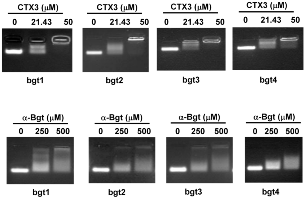 Electrophoretic mobility shift assay of the binding of bgt1, bgt2, bgt3, and bgt4 aptamers to CTX3 and α-Bgt: 5 μM aptamers against α-Bgt was incubated with indicated concentrations of CTX3 and α-Bgt for 20 min, and then the aptamer-toxin mixtures were separated on 2% agarose gel.