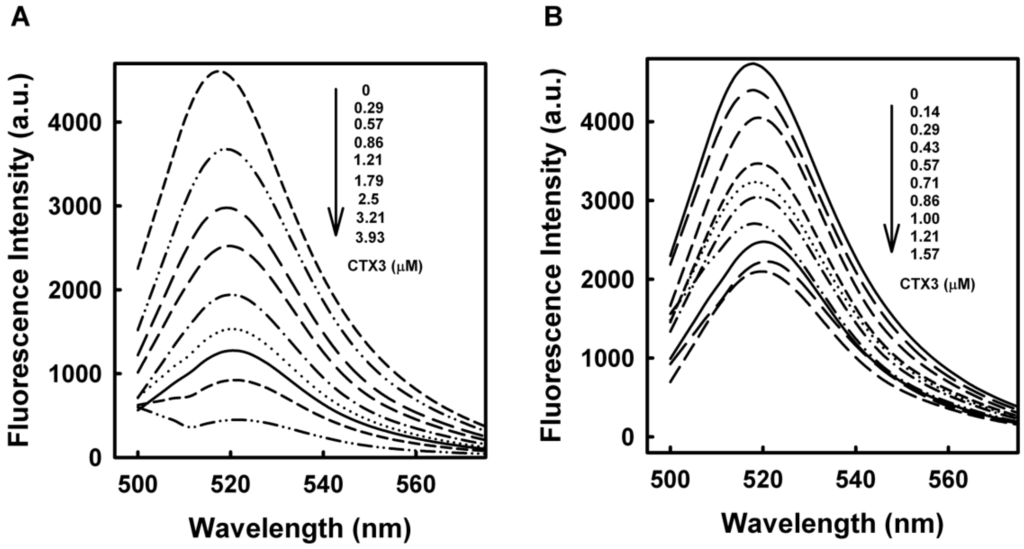 Fluorescence spectra of FAM-bgt1-DABCYL and FAM-bgt1 in the presence of various CTX3 concentrations as indicated: (A) FAM-bgt1-DABCYL and (B) FAM-bgt1 in 10 mM Tris-HCl (pH 7.5) containing 1 mM EDTA and 100 mM NaCl were titrated with CTX3.