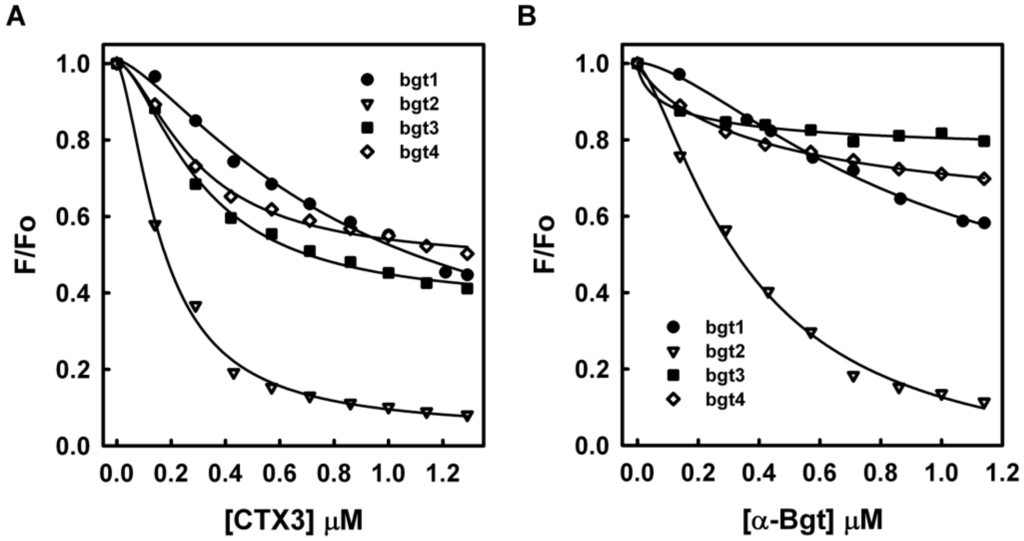 Effect of CTX3 and α-Bgt on fluorescence intensity of FAM-labeled bgt1, bgt2, bgt3, and bgt4 aptamers: the fluorescence intensity of FAM-labeled bgt1, bgt2, bgt3 and bgt4 was determined at 520 nm in the presence of various concentrations of (A) CTX3 or (B) α-Bgt. Fo and F represent the fluorescence intensity of FAM-labeled bgt1, bgt2, bgt3, and bgt4 in the absence and presence of toxins.