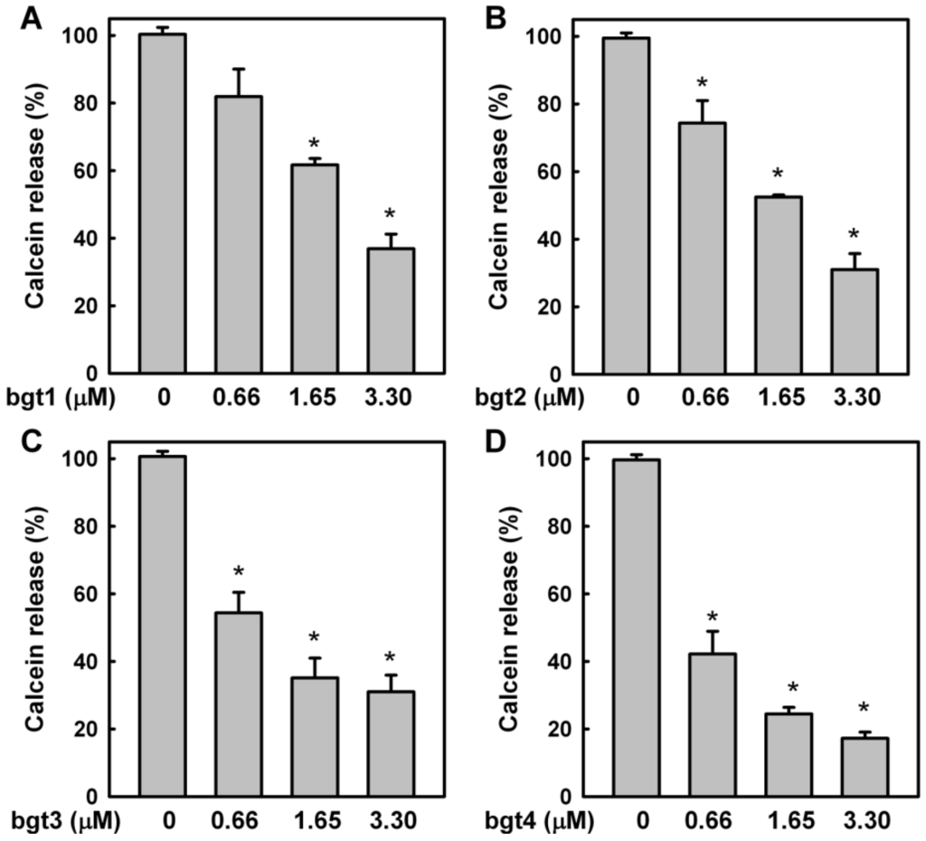Effect of bgt1 (A), bgt2 (B), bgt3 (C), and bgt4 (D) aptamers on membrane-damaging activity of CTX3: CTX3 (0.23 μM) was incubated with 0.66, 1.65, and 3.30 μM aptamers against α-Bgt for 20 min, and then membrane-damaging activity of CTX3-aptamer mixtures were measured. Data represents mean ± SD of three independent experiments with triplicated measurements (* p < 0.05, vs. CTX3 without incubation with aptamers). The experiments were performed in 10 mM Tris-HCl (pH 7.5) containing 1 mM EDTA and 100 mM NaCl. The signal was expressed as the percentage of total calcein release after addition of 0.2% Triton X-100.