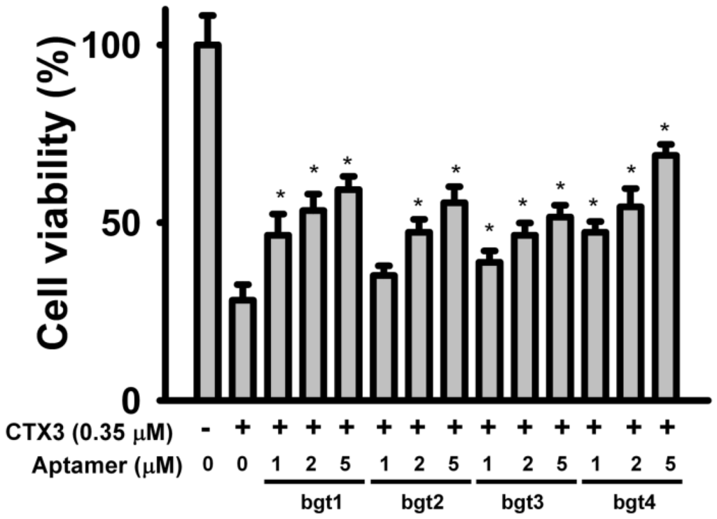 Effect of bgt1, bgt2, bgt3, and bgt4 aptamers on the cytotoxcity of CTX3: CTX3 (0.35 μM) was incubated with 1, 2, and 5 μM aptamers against α-Bgt for 20 min, and then the cytotoxicity of CTX3-aptamer mixtures were measured according to the procedure described in Materials and Methods section. Data represent mean ± SD of three independent experiments with triplicated measurements (* p < 0.05, vs. CTX3 without incubation with aptamers).