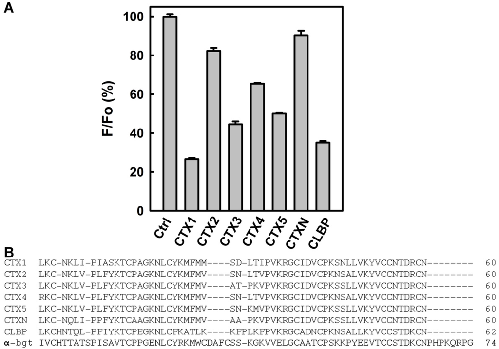 The fluorescence intensity of FAM-bgt1 in the presence of CTX isotoxins: (A) Fo and F represent the fluorescence intensity of FAM-bgt1 in the absence and presence of 1.5 μM CTXs. The fluorescence intensity was measured at 520 nm; and (B) amino acid sequence alignments of CTX1, CTX2, CTX3, CTX4, CTX5, CTXN, CLBP, and α-Bgt.