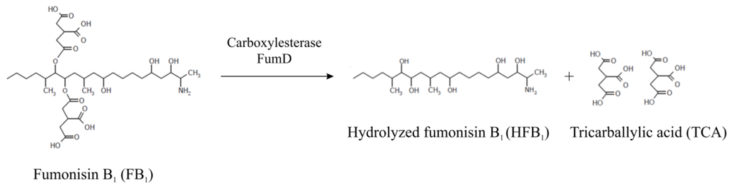 Mycotoxin adsorption is based on the ability of a feed additive to bind the toxin resulting in a reduction of its bioavailability and subsequent elimination via feces. The binder-toxin complex must be stable during the complete digestion process, while the unspecific adsorption of nutrients and minerals in the feed has to be avoided. The efficacy of a binding material depends on the physical properties and chemical structure of the binder and the target mycotoxin [22]. In general, high adsorption rates have been reported in vitro as well as in vivo for aflatoxins but not for other mycotoxins, such as fumonisins, zearalenone, and trichothecenes [23]. An alternative approach for the elimination of mycotoxins in vivo is the biotransformation and resulting degradation of mycotoxins into non-toxic metabolites by microorganisms or purified enzymes. Several microorganisms with the capability to degrade mycotoxins have been isolated from soil, gut microbiota, or rumen fluid [24]. Previously, our group isolated the fumonisin-degrading bacterium Sphingopyxis sp. MTA144 from soil, elucidated the respective catabolic pathway and identified the gene cluster encoding enzymes for FB1 degradation [25,26,27]. Most prominently, FumD, a type-B carboxylesterase, was found to catalyze detoxification of FB1 by hydrolysis of both tricarballylic acid (TCA) side chains (Figure 1). The resulting compound, hydrolyzed fumonisin B1 (HFB1), has been demonstrated to have a greatly reduced toxicity compared to FB1 in rodents and pigs [28,29,30,31].