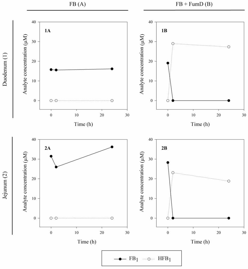 Activity of FumD under digestive conditions (ex vivo pig model). Concentrations of FB1 and HFB1 (µM) were determined in intestinal contents of duodenum (1) and jejunum (2) previously spiked with 5 mL of an FB1 solution (83.1 µM, aiming for final concentration of 13.9 µM in intestinal contents) and additionally treated with 5 mL of pure water (FB (A)) or 5 mL of water containing FumD (1.2 U/mL, aiming for final concentration of 0.2 U/mL in intestinal contents, FB+FumD (B)). Samples were collected prior to (0 h) and after 2 h and 24 h of incubation at 39 °C, respectively.