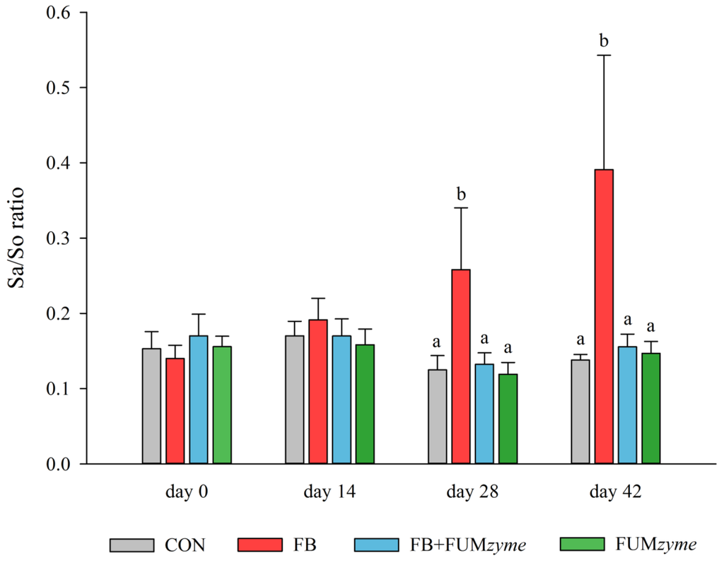 Mean serum sphinganine-to-sphingosine ratios (Sa/So) of piglets receiving either basal feed (CON), fumonisin-contaminated feed (2 mg/kg FB1+FB2; FB), fumonisin-contaminated feed supplemented with FUMzyme (2 mg/kg FB1+FB2, 60 U/kg FUMzyme; FB+FUMzyme), or basal feed supplemented with FUMzyme (60 U/kg; FUMzyme). Samples were collected from individual piglets (n = 10) prior to and after 14, 28, and 42 days of exposure to the different treatment diets, respectively. Error bars represent the standard deviation and superscript letters indicate significant differences between treatment groups (p < 0.05).
