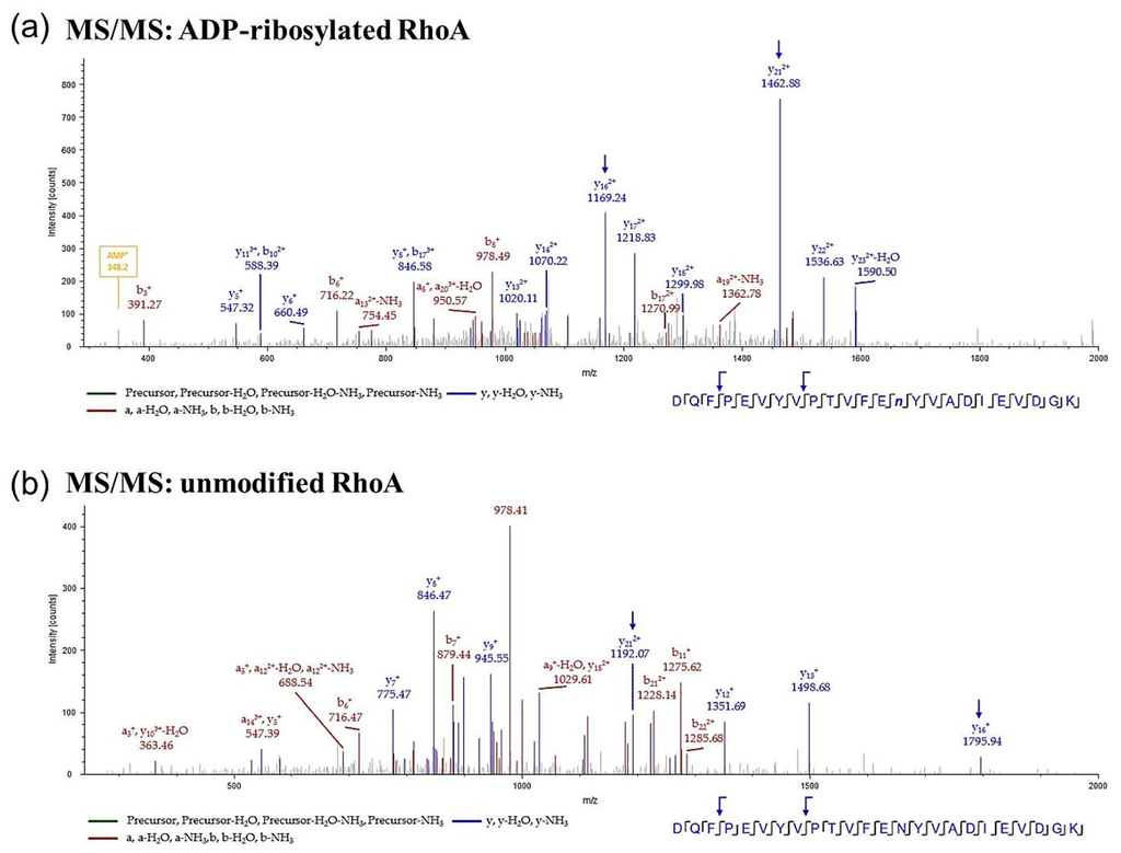 Mass spectrometric detection of ADP-ribosylated RhoA in CHO cells. CHO cells were treated with 500 nM C3 or C3-E174Q for 10 min. Untreated cells served as control. Subsequently, cell lysates were separated by 15% SDS-PAGE and stained with Coomassie brilliant blue. The samples of 20–30 kDa bands were digested with trypsin and peptides were subjected to mass spectrometry analysis. A MS/MS spectrum of the analyzed RhoA peptide is shown. (a) Identification of ADP-ribosylated RhoA; and (b) unmodified RhoA, blue arrows show specific y-ions/fragments of the modified or unmodified peptide.
