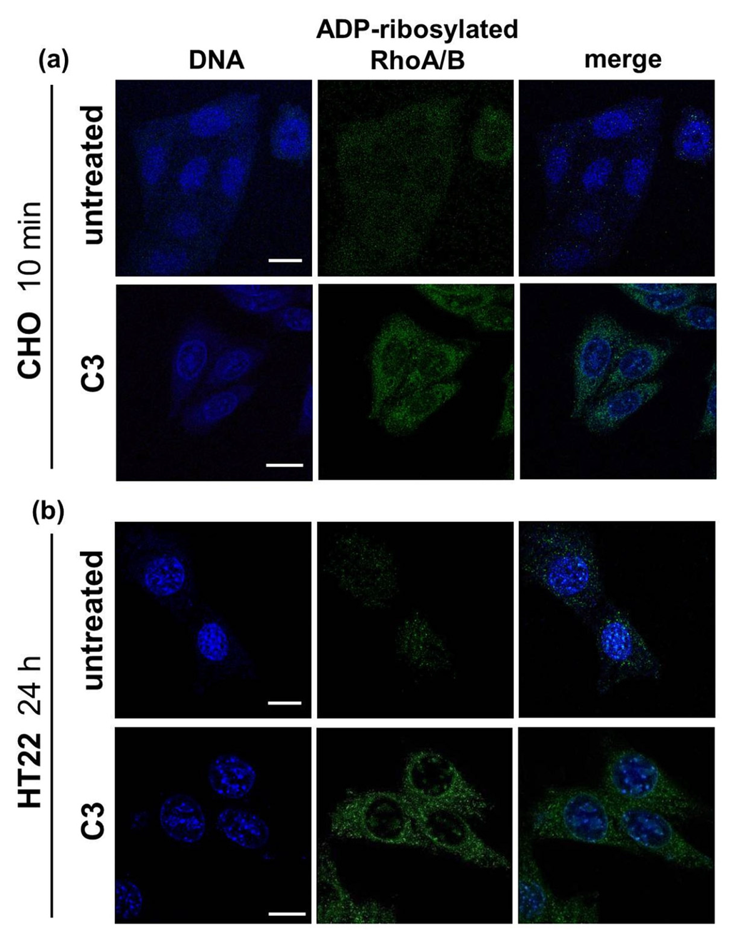 To investigate the subcellular localization of ADP-ribosylated RhoA/B, the antibody against ADP-ribosylated RhoA/B (ViF140_A1-hFc) was used in immunocytochemistry. Fluorescence microscopy showed in both cell lines ADP-ribosylated RhoA/B after C3 treatment, whereas untreated CHO (a) and HT22 (b) control cells exhibited weak and diffusely distributed signal (Figure 8). The punctate staining (ADP-ribosylated RhoA/B) was distributed throughout the cytosol. Furthermore, some bright punctuate spots were also found inside the nucleus supporting nuclear localization of ADP-ribosylated RhoA/B.