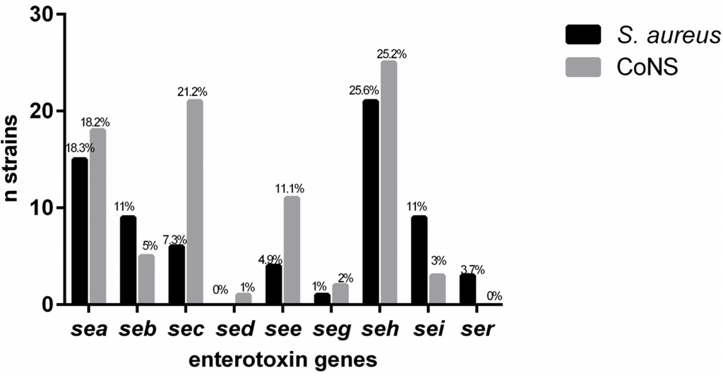 Molecular typing by Pulsed-field gel electrophoresis (PFGE) was performed only on the S. aureus and S. epidermidis isolates that in which any enterotoxin genes had been detected. Therefore, among the 181 strains included in the study, 27 S. aureus isolates and 15 S. epidermidis isolates were analyzed, corresponding to the species with the highest prevalence of strains carrying enterotoxin genes.