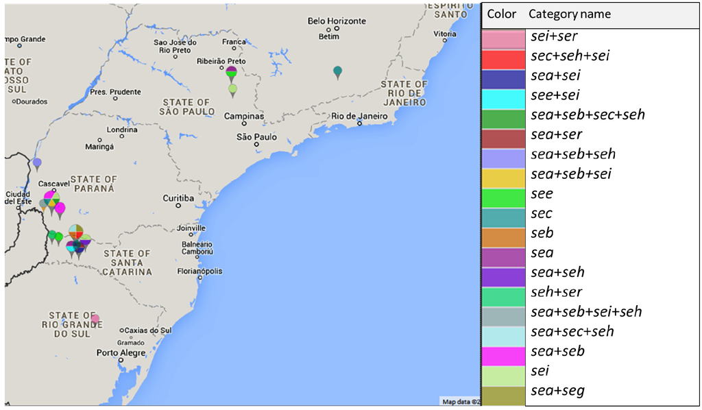 The ser gene was detected in three S. aureus isolates, all from the South regions. This gene was found to coexist with some other enterotoxins since two strains from SC carried the combination ser + sea or ser + sec, while in the third isolate from RS, ser was associated with the enterotoxin I gene (sei). These data highlight the importance of knowledge on movable genetic elements that can transfer these genes among Staphylococcus spp. The same has been described by Lawrynowicz-Paciorek et al. [] who also evaluated the frequency of coexisting genes.