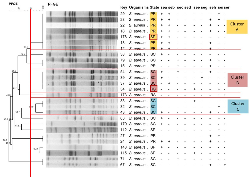 Analysis permitted the identification of three S. aureus clusters that simultaneously included ≥3 isolates with similarity ≥80% (Figure 3, Table 2). Similarity was 100% in all groups. Cluster A, consisting of seven strains, contained a larger number of isolates with enterotoxigenic potential. This cluster comprised six isolates from Paraná and one isolate from São Paulo. The other clusters (B and C) also contained isolates from the South region, but from the state of Santa Catarina (Table 2). Cluster B comprised isolates originating from different states (SC and RS).