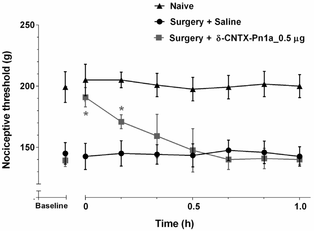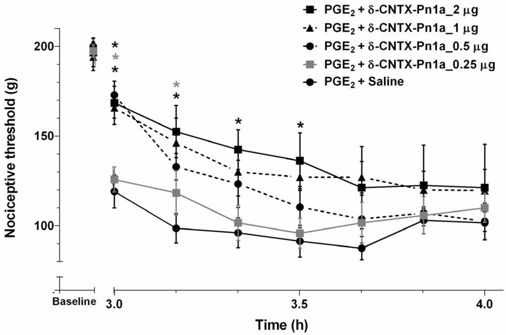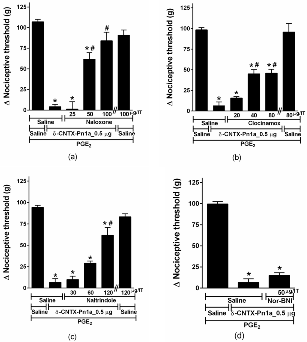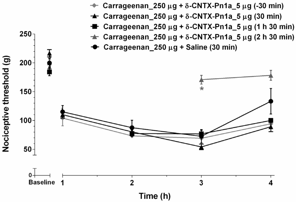 2.1. Effect of δ-CNTX-Pn1a on Carrageenan-Induced Inflammatory Hyperalgesia