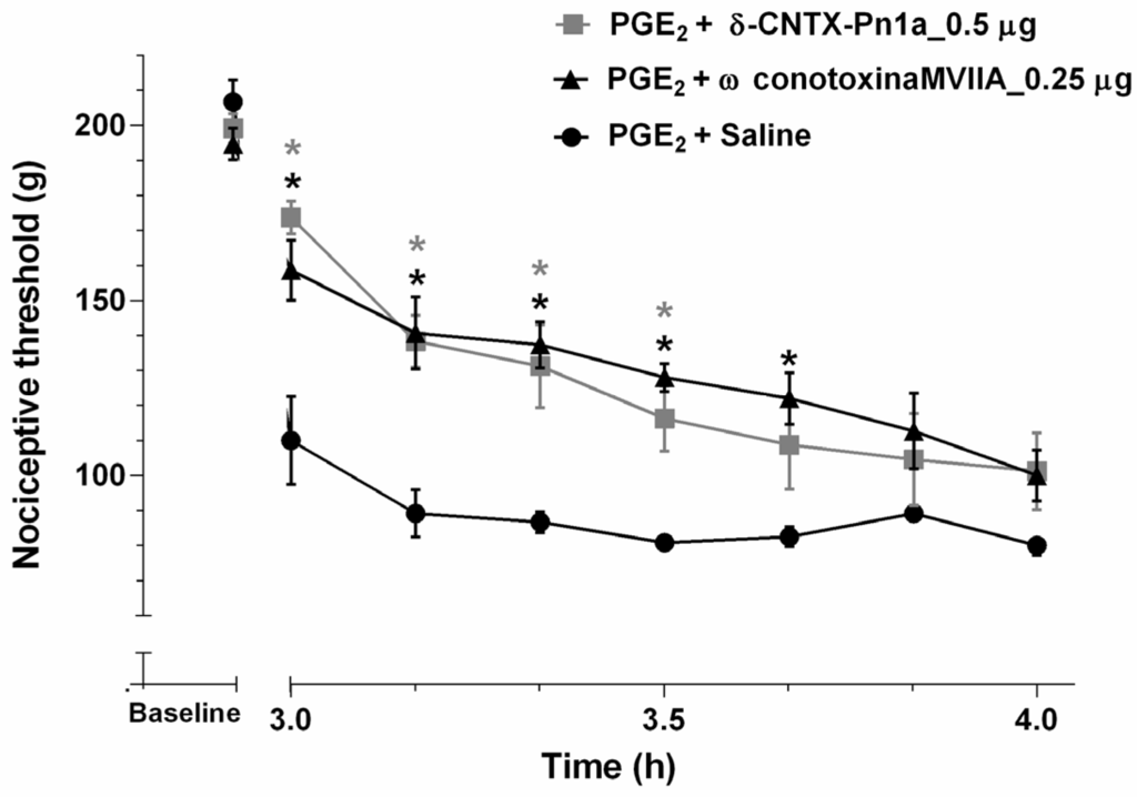 2.3. Effect of δ-CNTX-Pn1a on Prostaglandin E2-Induced Hyperalgesia and Comparison between δ-CNTX-Pn1a and ω-Conotoxina MVIIA Antinociceptive Activity