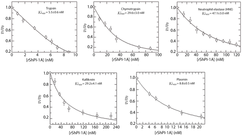 As observed in Figure 1, rShPI-1A affected the enzymatic activities of trypsin-like enzymes, i.e., pancreatic trypsin, plasmin and kallikrein. It also inhibited the activity of chymotrypsin and human neutrophil elastase (HNE). Binding to the latter is in contrast with the absence of activity against pancreatic elastase (Table 1), a behavior also detected in the natural molecule [7]. The concave inhibition curves obtained under experimental conditions of [Eo]/Ki = 1–10 indicated that rShPI-1A is a reversible inhibitor of pancreatic trypsin, as previously described [8], as well as of chymotrypsin, HNE, plasmin and kallikrein. This behavior allowed determining the apparent Ki values (Figure 1).