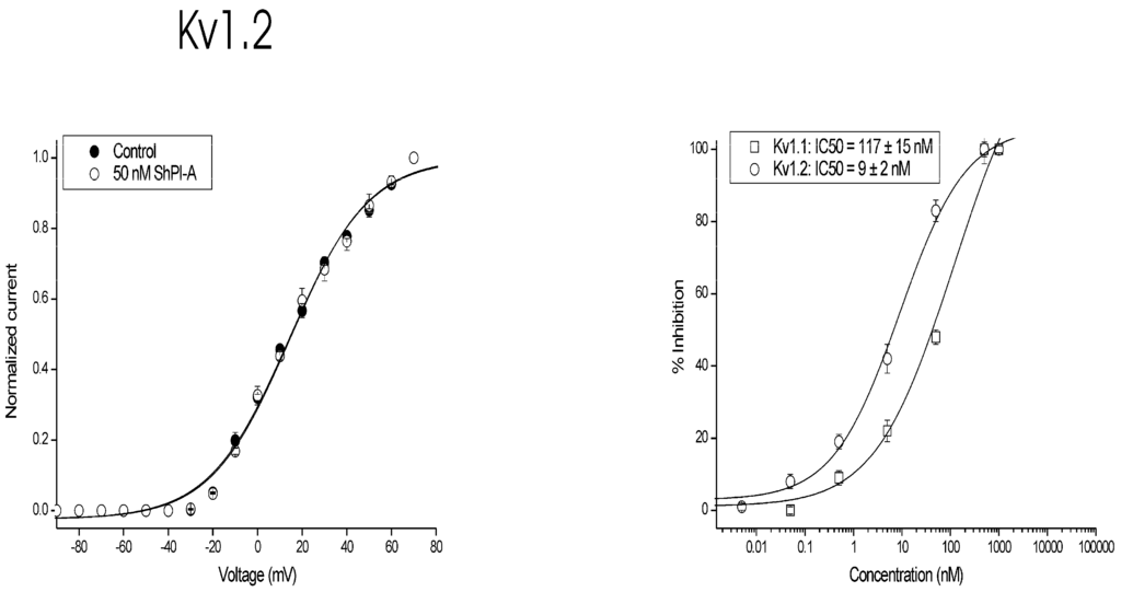 Characterization of rShPI-1A activity on channel gating. Left panel: current-voltage relationship. Closed symbols are the control condition; open symbols are after application of 50 nM peptide. Right panel: concentration-response curve on Kv1.1 and Kv1.2 channels obtained by plotting the percentage of blocked current as a function of increasing toxin concentrations. All data represent at least three independent experiments (n ≥ 3) and are presented as the mean ± standard error.