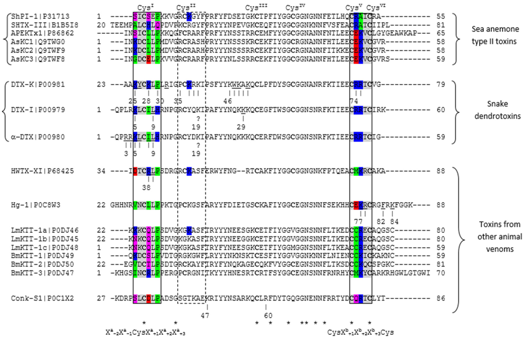Next, we included similar toxins from other venomous animals, some of them with known residues involved in Kv channel inhibition or with 3D structures already described. Information about all toxins used in the sequence comparison is shown in Table 3. As shown in Figure 4, the functional dyads or other key residues in DTXs and similar toxins from other venomous animals are located mainly toward the N- and C-terminal regions of the proteins, in particular around CysI and CysV-CysVI, respectively.