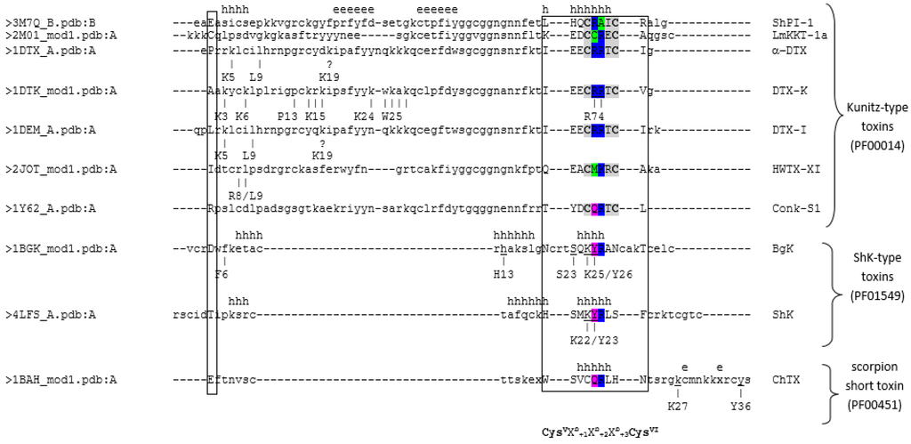 Structure-based sequence alignment of Kv-channel blocking toxins. Uppercase letters represent the equivalent position in the 3D superimposition. Continuous line boxes enclose those regions that superimpose well among toxins sharing the BPTI-Kunitz fold and those from ShK-type and scorpion-type families, also active against Kv channels. Information about their respective secondary structure elements, helix (h) and β-sheet (e), is shown over each sequence, based on ShPI-1 as representative of all BPTI-Kunitz-type proteins and the toxins ShK, BgK and ChTx. Information about toxin family, including the Pfam database (PF) code, is shown at the right. Conserved Cys residues are in bold, and positions buried to solvent or partially exposed are highlighted in gray. Residues with a negative charge are highlighted in red; positive charge (blue); polar uncharged (magenta); and hydrophobic (green).
