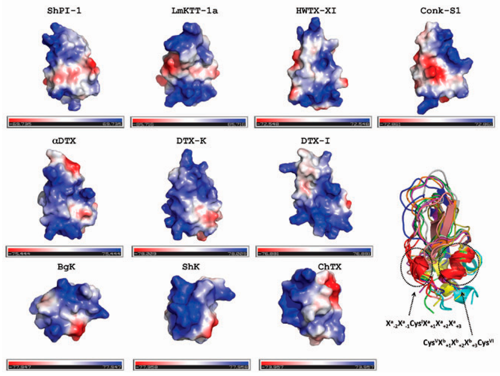 Surface electrostatic potential representation of toxins. The surface is colored according to the electrostatic potential: negative regions (in red), positive regions (in blue) and neutral regions (in gray). The orientation of the surface electrostatic potentials is the same as that in the ribbon representation at the bottom right. The list of PDB codes for toxins is as follows: ShPI-1 (3M7Q); LmKTT-1a (2M01); HWTX-XI (2JOT); Conk-S1 (1Y62); α-DTX (1DTX); DTX-K (1DTK); DTX-I (1DEM); BgK (1BGK); ShK (4LFS); and ChTX (1BAH). We also provided a color intensity scale to better represent the electrostatic potential. BPTI-Kunitz-type toxins are displayed in the first two lines. These figures were prepared with the PyMOL Molecular Graphics System, Schrödinger, LLC.